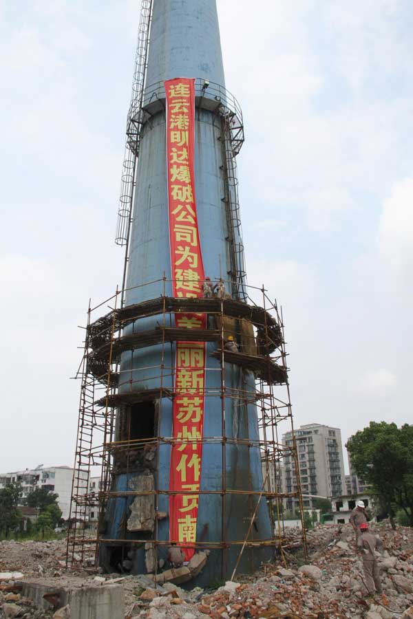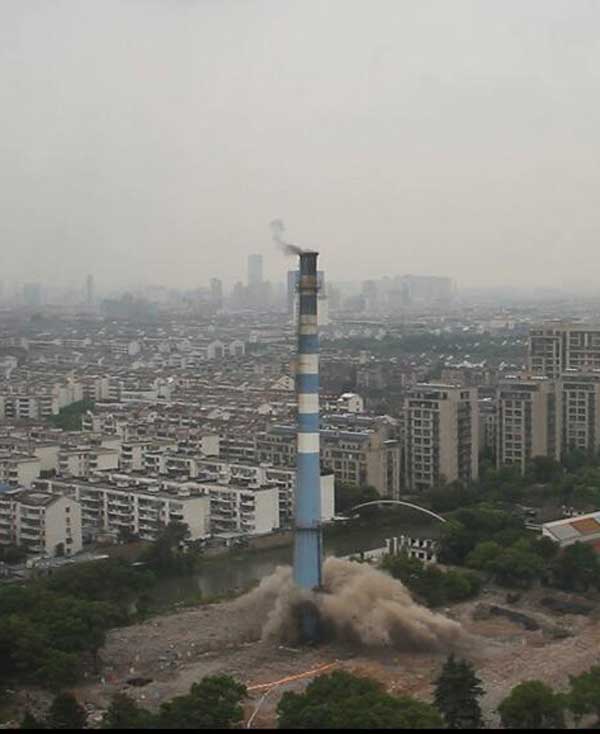 蘇州市地標(biāo)建筑之一,矗立在蘇州城南的蘇州熱電廠大煙囪,該煙囪高80m,周圍有小區(qū)、學(xué)校、高架橋、小商品市場,爆破環(huán)境復(fù)雜。我公司技術(shù)人員仔細(xì)勘察現(xiàn)場后,編制詳細(xì)的爆破方案。最終于2016年8月26日下午3點整實施爆破拆除,伴隨蘇州人33年的電熱廠大煙囪從此成為歷史。