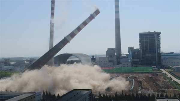 2017年5月18日14時(shí)28分,連云港明達(dá)工程爆破有限公司成功拆除了射陽(yáng)港發(fā)電有限公司內(nèi)的兩座煙囪。煙囪按設(shè)定方位傾倒,整個(gè)爆破取得圓滿(mǎn)成功,此次爆破為江蘇省內(nèi)完成的首例同時(shí)爆破拆除兩座高達(dá)150m的混凝土煙囪。